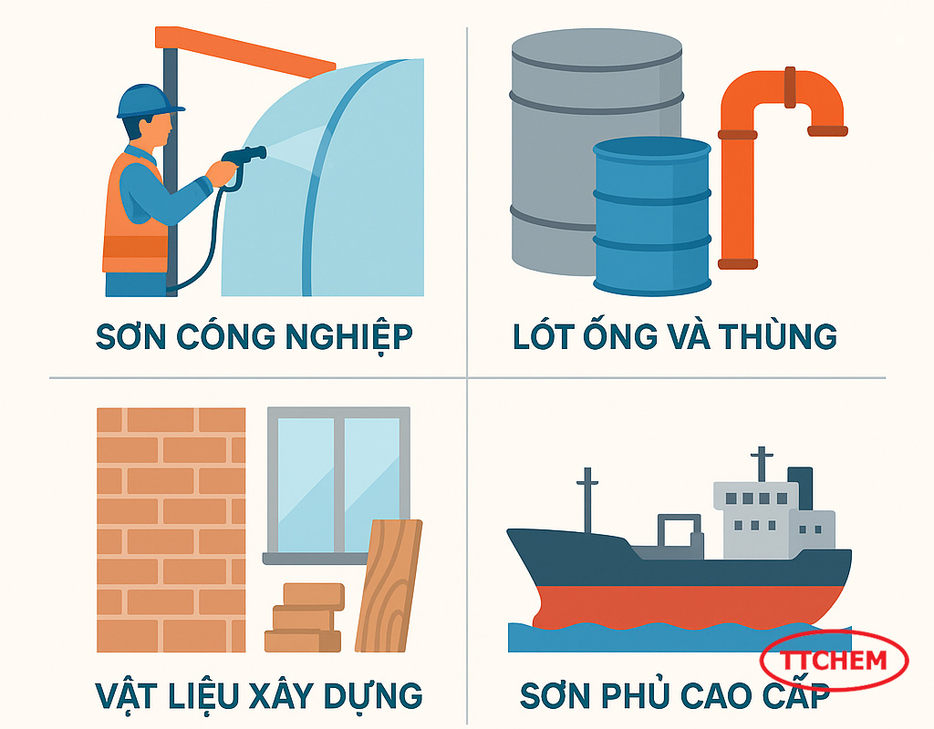 Nhựa Epoxy BE-501X-75 được sử dụng rộng rãi trong nhiều ngành công nghiệp nhờ tính chất vượt trội về cơ học, độ bám dính và khả năng chống chịu hóa chất. Trong sản xuất sơn công nghiệp, BE-501X-75 thường được kết hợp với các loại nhựa acrylic hoặc alkyd để tạo ra sơn đóng rắn bằng nhiệt (baking coatings), giúp tăng cường độ cứng, khả năng chống ăn mòn và độ bền thời tiết của lớp phủ. Đây là lựa chọn lý tưởng cho các loại sơn bảo vệ bề mặt kim loại trong môi trường công nghiệp nặng hoặc môi trường biển có độ ăn mòn cao.